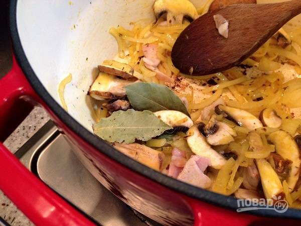 3. Добавьте кусочки бекона, немного соли и перца, а также любимые специи, травы. Жарьте на среднем огне, помешивая, минут 5.