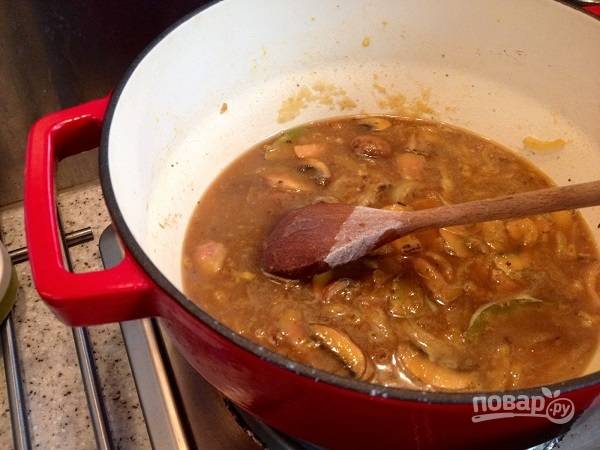 5. Влейте бульон, доведите до кипения и томите еще минут 5.