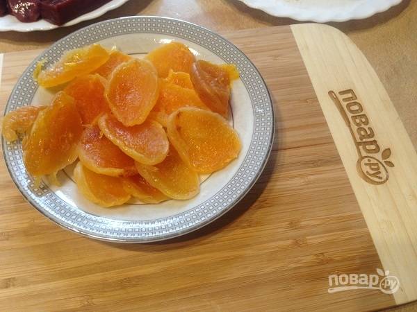2. Курагу залейте кипятком минут на 10, затем воду слейте, а курагу разрежьте либо пополам, либо на кусочки помельче.
