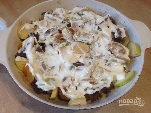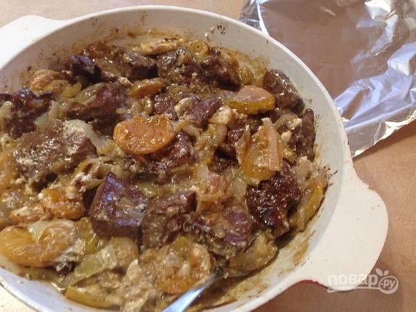 7. Покрываем все сметаной, накрываем фольгой и ставим в разогретую до 200 градусов духовку на полчаса. Затем снимем фольгу, перемешиваем печень и оставим в духовке еще минут на 5.