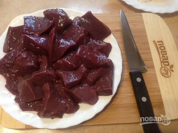 2. Печень очистим от протоков и снимем пленку. Тщательно промоем и обсушим печень и нарежем на кусочки толщиной чуть больше 1 см.