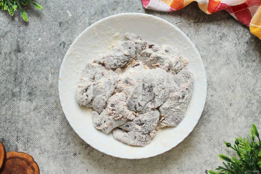 В чашу насыпьте муку и выложите говяжью печень без молока, перемешайте, чтобы каждый кусочек был покрыт.