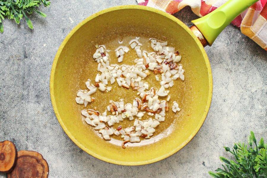 Репчатый лук мелко порежьте. В сковороду налейте растительное масло и разогрейте на среднем огне. Выложите в сковороду репчатый лук и обжаривайте на среднем огне в течение 4-5 минут, перемешивая. Переложите его в тарелку.
