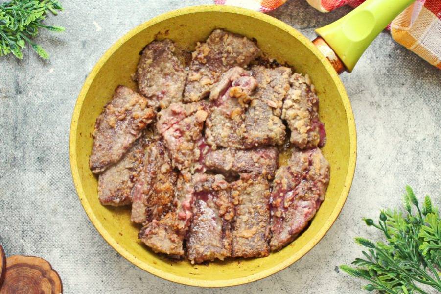 Выложите печень в сковороду после лука и обжаривайте с двух сторон до корочки.