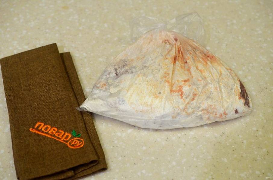 4. В пакет насыпьте муку, добавьте кусочки печени и хорошо потрясите, чтобы печень покрылась мукой.