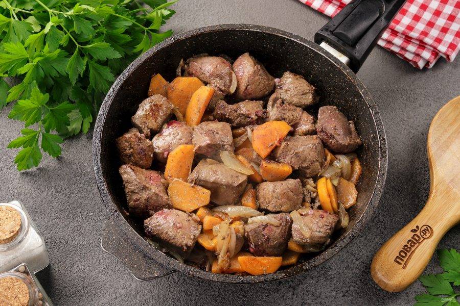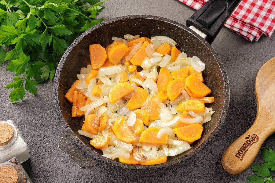 Перемешайте и готовьте всё вместе на среднем огне 5-7 минут.