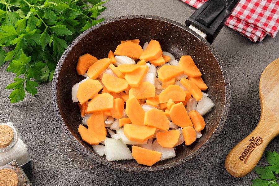 Разогрейте сковороду с маслом. Выложите нарезанные лук с морковью. Нарезка может быть любая на ваш вкус.