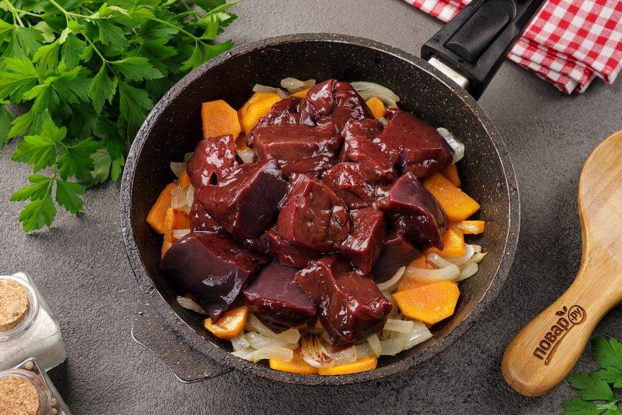 Подготовьте все ингредиенты. Печень лучше брать охлажденную, в ней содержится больше витаминов и полезных веществ, чем в замороженной. Печень обмойте, при необходимости удалите плёночку и жир. Нарежьте печень небольшими кусочками или кубиками.