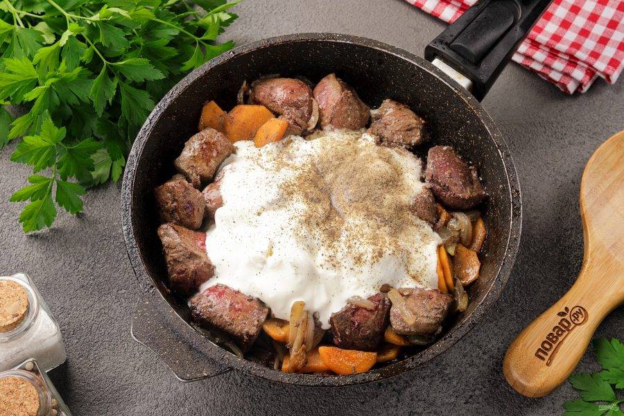 Затем добавьте сметану, соль и перец по вкусу. По желанию можно добавить еще какие-либо приправы. Перемешайте, накройте сковороду крышкой и тушите около 10-15 минут.