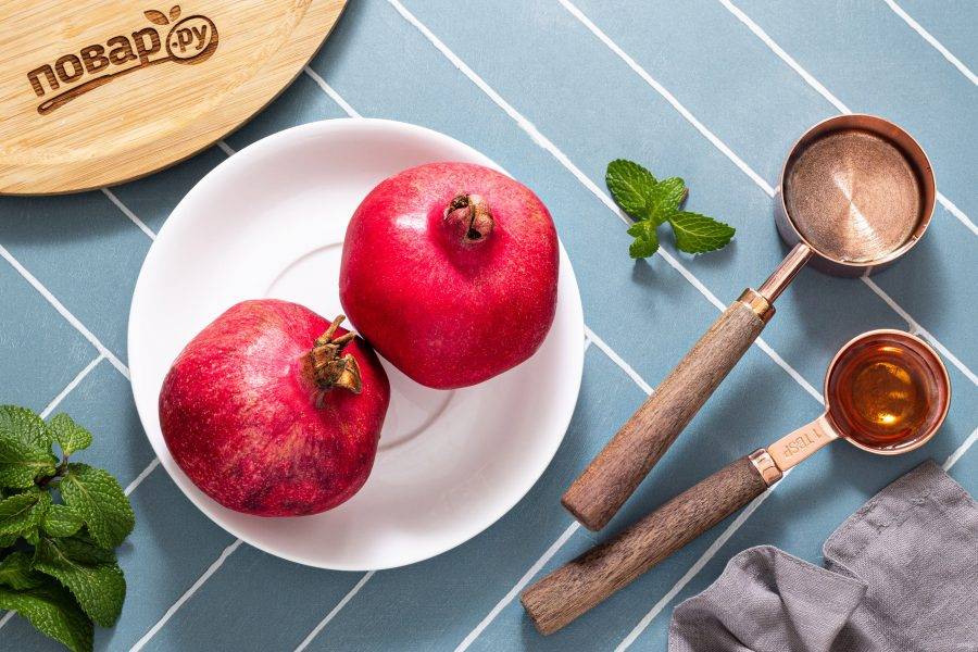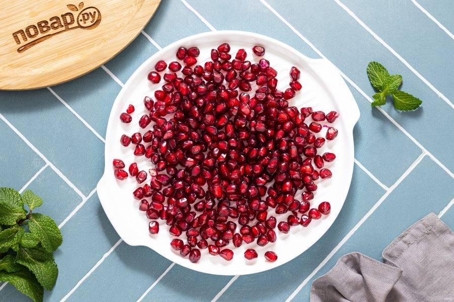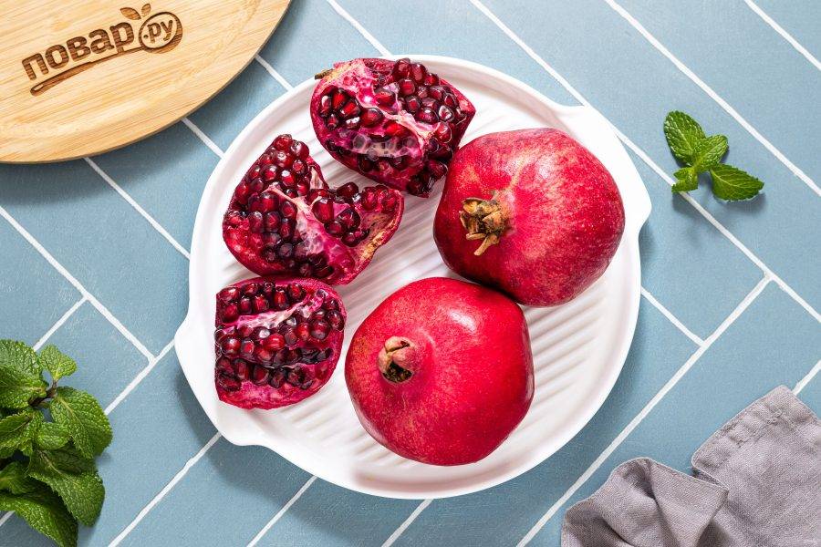 Гранаты помойте. Острым ножом сделайте надрезы и разделите на 4 части каждый гранат.