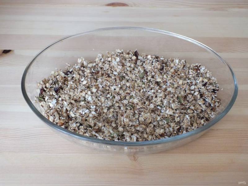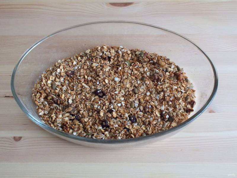 Готовая гранола имеет слегка зарумяненный вид. Охладите, пересыпьте в тару с крышкой и храните в темном месте.