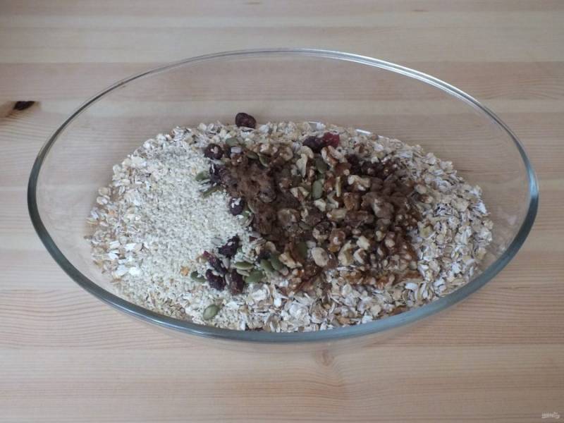 Возьмите широкую форму или противень. Смешайте в нем овсяные хлопья, злаковую смесь с ягодами, орехи, кунжут, корицу.