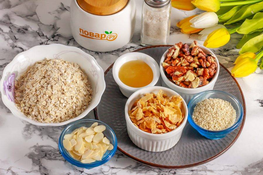 Подготовьте указанные ингредиенты. Вместо кунжута можно использовать вяленую клюкву, курагу и прочие сухофрукты, но не чернослив. Чернослив придаст граноле темноватый цвет.