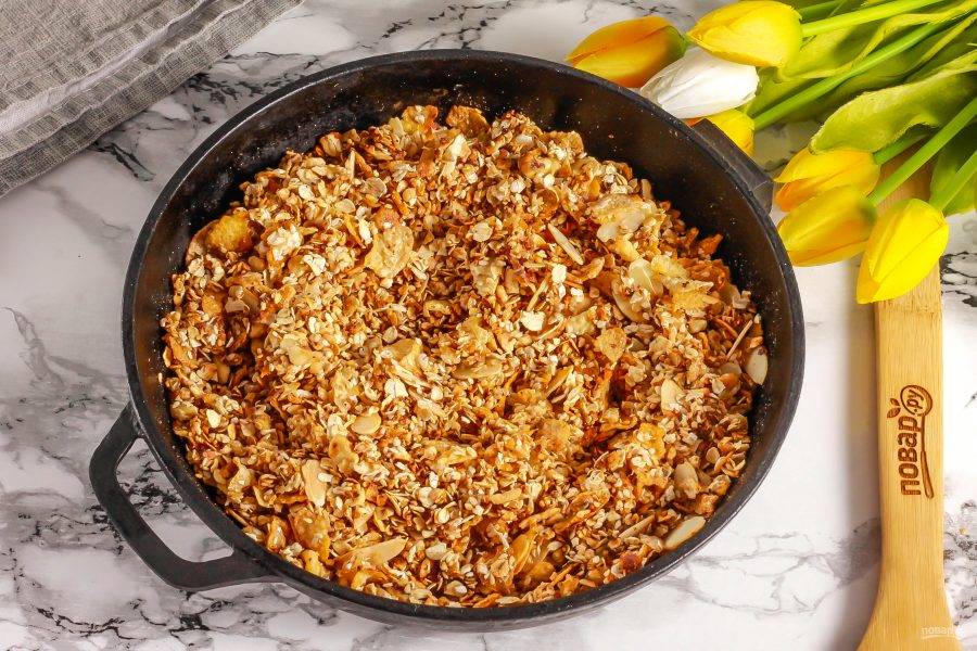 Запеченную гранолу вынесите на холод, чтобы она остыла и карамелизировалась. На это понадобится примерно 20-30 минут.
