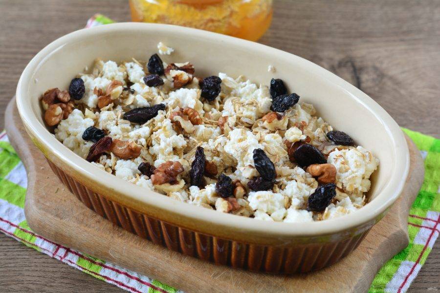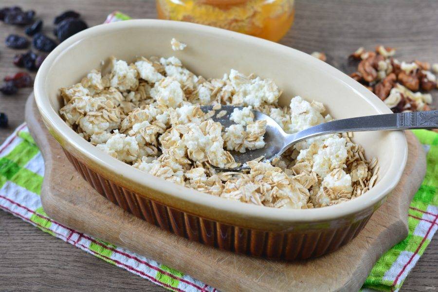 Смажьте форму для выпекания маслом, выложите овсяные хлопья и творог, немного перемешайте.