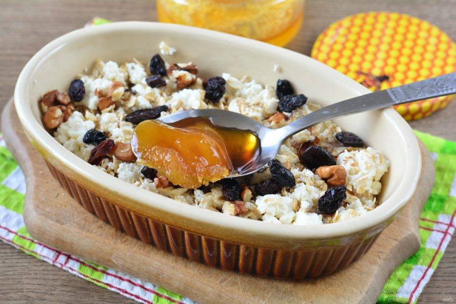 Питательную и вкусную гранолу с творогом приготовьте на завтрак или на обед. Дополните блюдо горячим чаем или молоком.