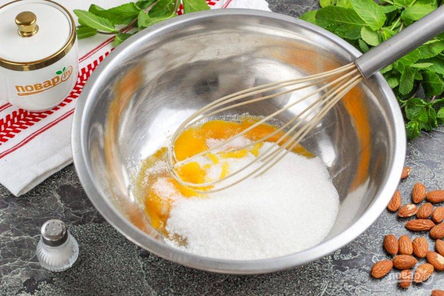 Затем в глубокой емкости взбейте куриные желтки с оставшимся сахарным песком и солью.
