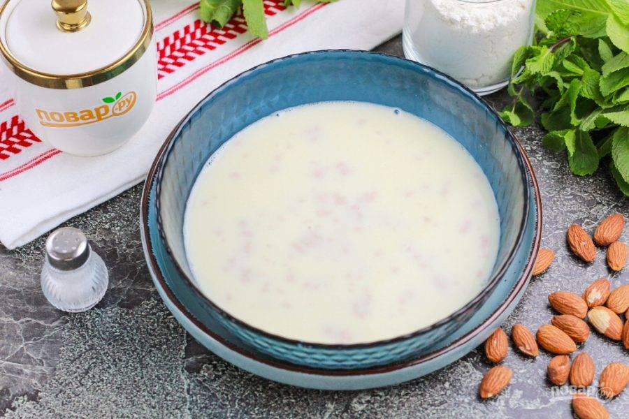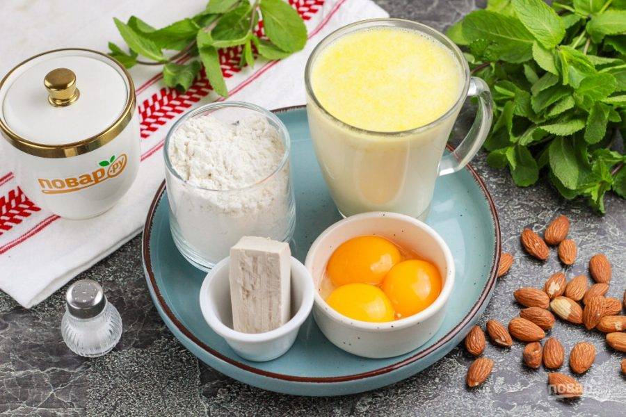 Подготовьте указанные ингредиенты. Если используете жирное, домашнее молоко, то сливочное масло можно не добавлять. Если молоко магазинное, то дополнительно прогрейте его с 50 граммами сливочного масла, чтобы оно растопилось. Свежие дрожжи можно заменить на 10 граммов сухих дрожжей. Миндаль замочите в воде.