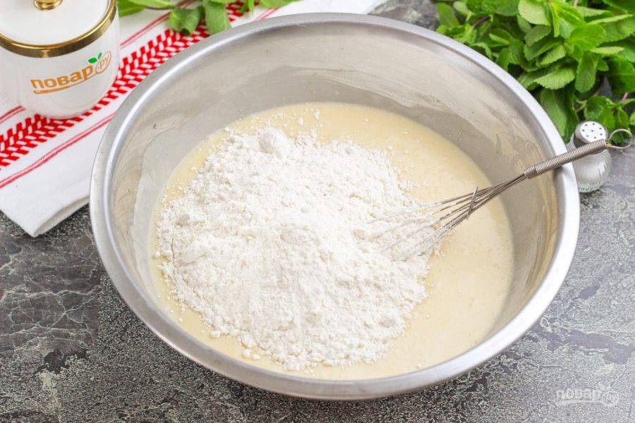Всыпьте 4 ст.л. пшеничной муки и столько же сахара, снова все взбейте венчиком, чтобы не было комочков.