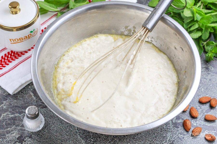Накройте емкость полотенцем и оставьте на 20-30 минут для поднятия опары. Пока опара поднимается, снимите кожуру с миндаля и измельчите его ножом.
