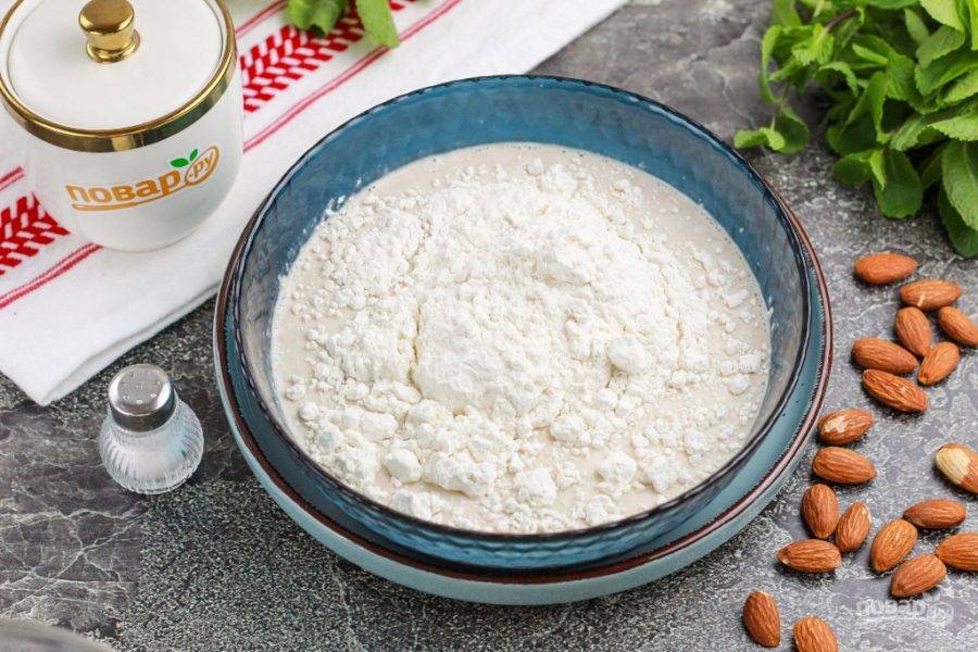 Всыпьте просеянную пшеничную муку высшего сорта и измельченный миндаль, замесите тесто в течение 10-15 минут. Время от времени натирайте руки растительным маслом, чтобы удобно было работать с дрожжевым тестом. Накройте емкость полотенцем и оставьте для расстойки на 1 час.