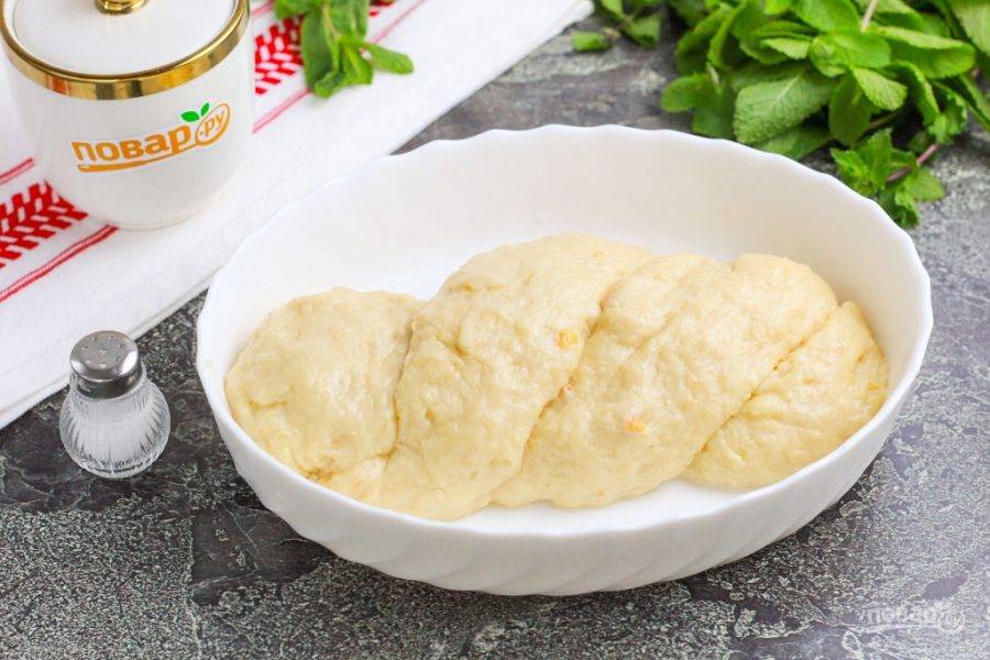 Сбрызните форму для выпекания растительным маслом и разделите тесто на две или три части. Перекрутите их между собой и выложите в форму, подмяв узелки под него. Еще раз накройте полотенцем и дайте заготовке вырасти в течение получаса.