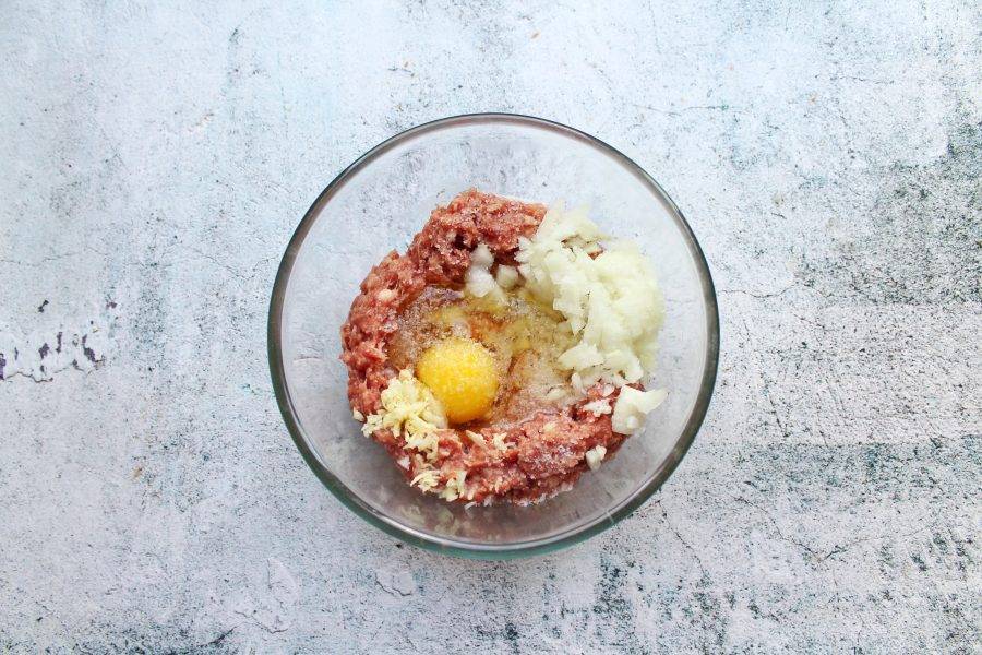 В миску выложите мясной фарш, мелко нарезанный репчатый лук, измельченный чеснок и вбейте яйцо. Все хорошо перемешайте.