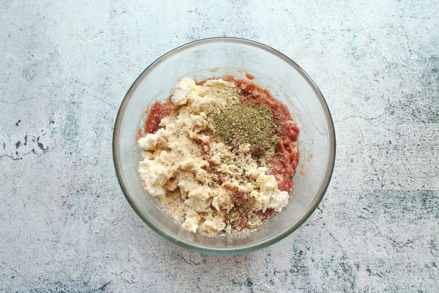 Всыпьте панировочные сухари, орегано, соль, черный перец.
