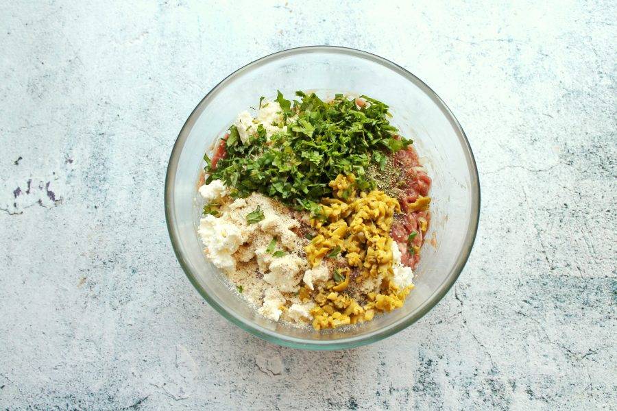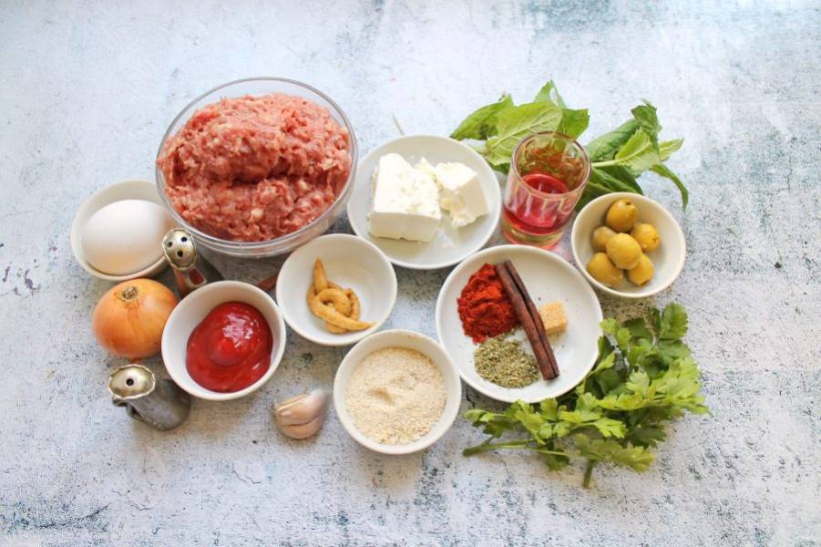 Подготовьте все необходимые ингредиенты для приготовления греческого мясного рулета.