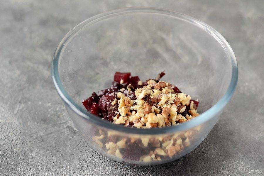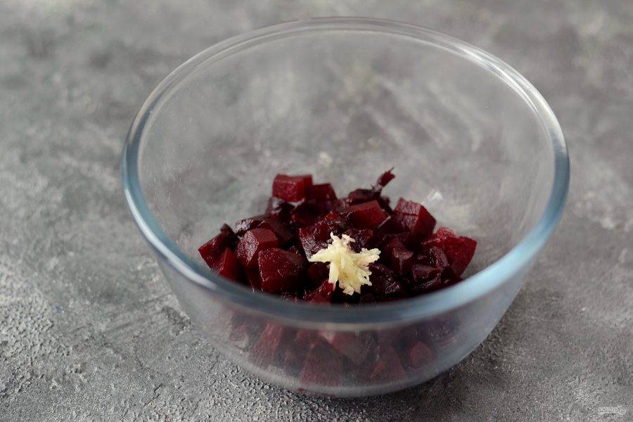 Свеклу остудите, очистите и нарежьте на мелкие кубики. Чеснок пропустите через пресс.