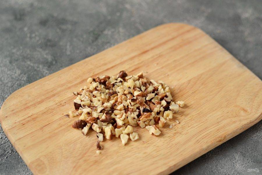 Добавьте измельченные грецкие орехи, соль и черный молотый перец.