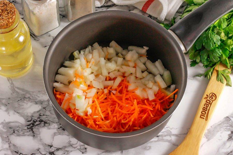 Очистите морковь и лук от кожуры, промойте в воде. Натрите морковь на терке с мелкими ячейками, а лук нарежьте мелкими кубиками. Обжарьте все в казане или сковороде с высокими бортиками 3-4 минуты, налив в емкость растительное масло.