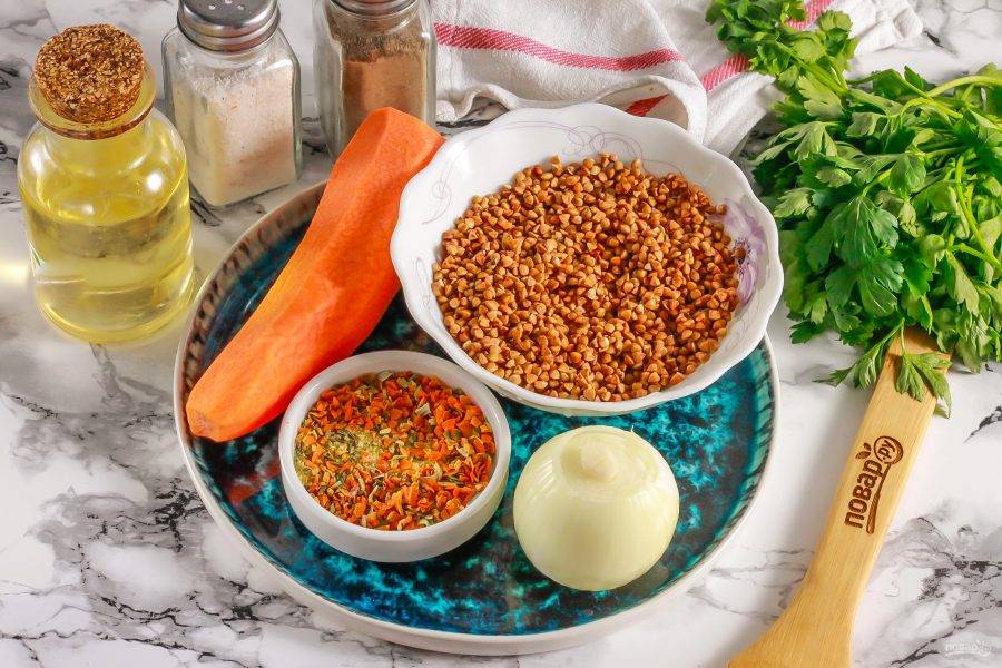 Подготовьте необходимые ингредиенты. Промойте гречневую крупу в воде, удалите подгоревшие зерна, если они присутствуют в ней.