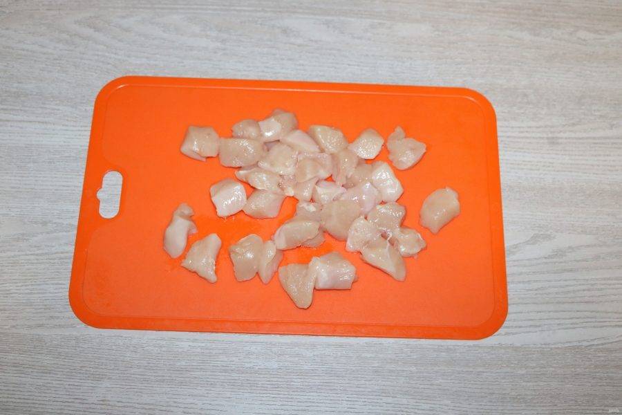 Куриное филе помойте, обсушите бумажным полотенцем. Нарежьте кубиками.