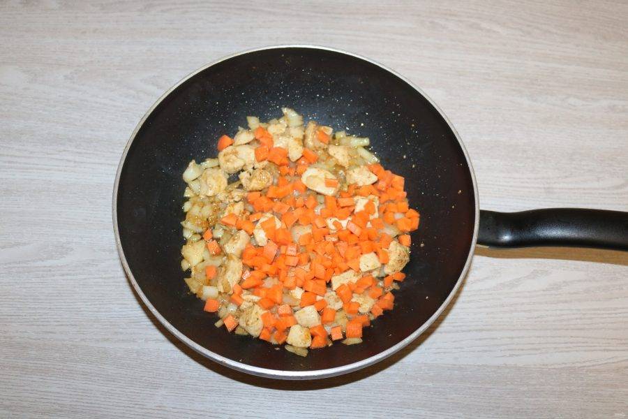 Добавьте морковь, обжаривайте вместе.
