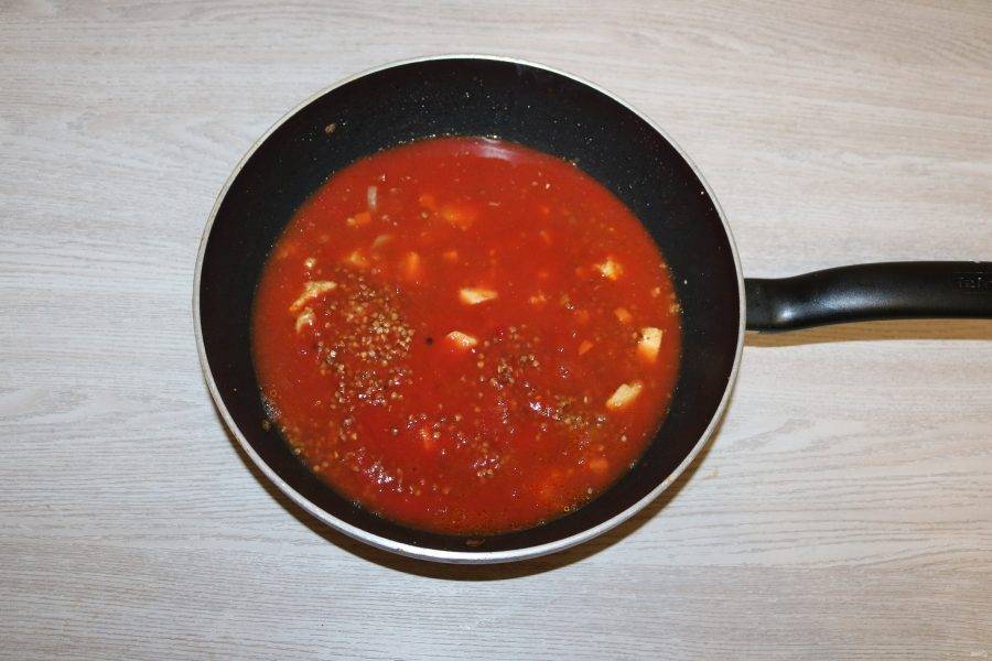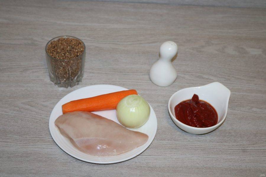 В двух стаканах кипятка размешайте томатную пасту. Залейте гречку с мясом. Посолите по вкусу.