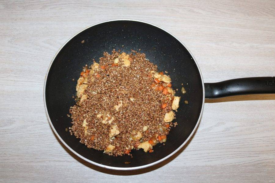 Гречку переберите, промойте, добавьте в сотейник.