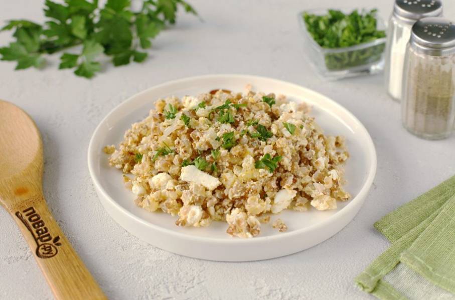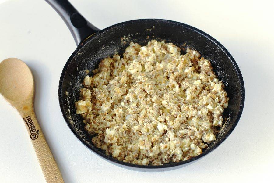 Переложите гречку в сковороду, добавьте брынзу с луком и яйцом. Все перемешайте и прогрейте в течение 5 минут. Гречка с брынзой готова.