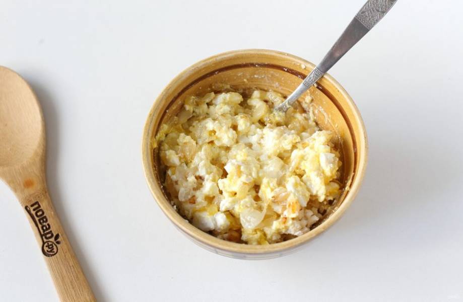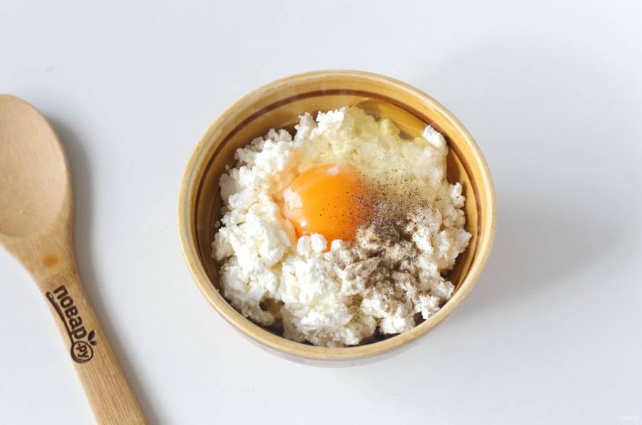 Добавьте яйцо, черный молотый перец и соль по вкусу. С солью не переборщите, по желанию ее и вовсе можно не добавлять, так как брынза сама по себе уже соленая.