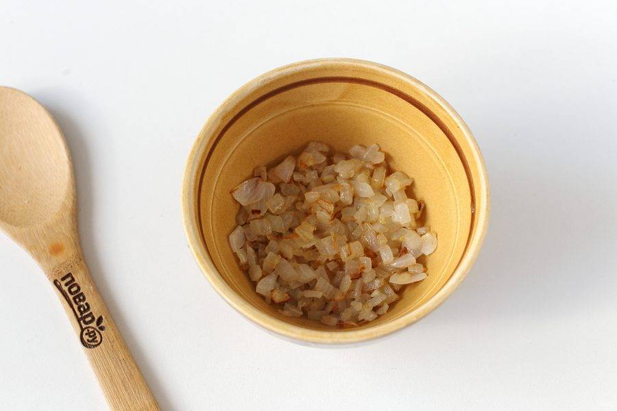 Лук нарежьте кубиками, обжарьте и переложите в глубокую тарелку.