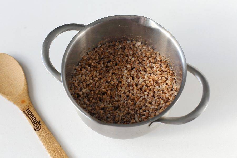Для начала отварите гречку. Пропорция гречневой крупы и воды: 1:2 соответственно.