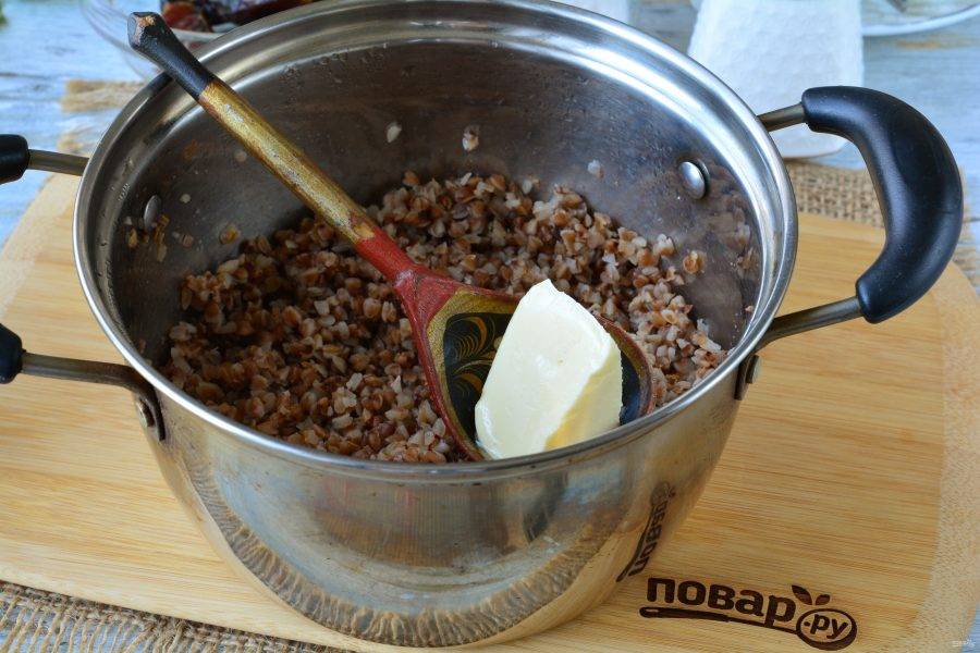 Варите гречку еще 5 минут, затем добавьте сливочное масло и перемешайте.