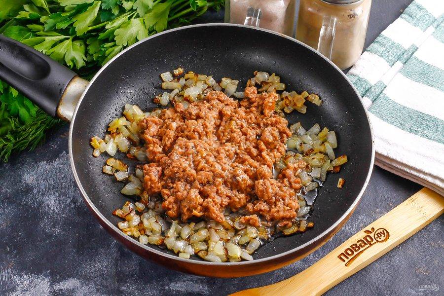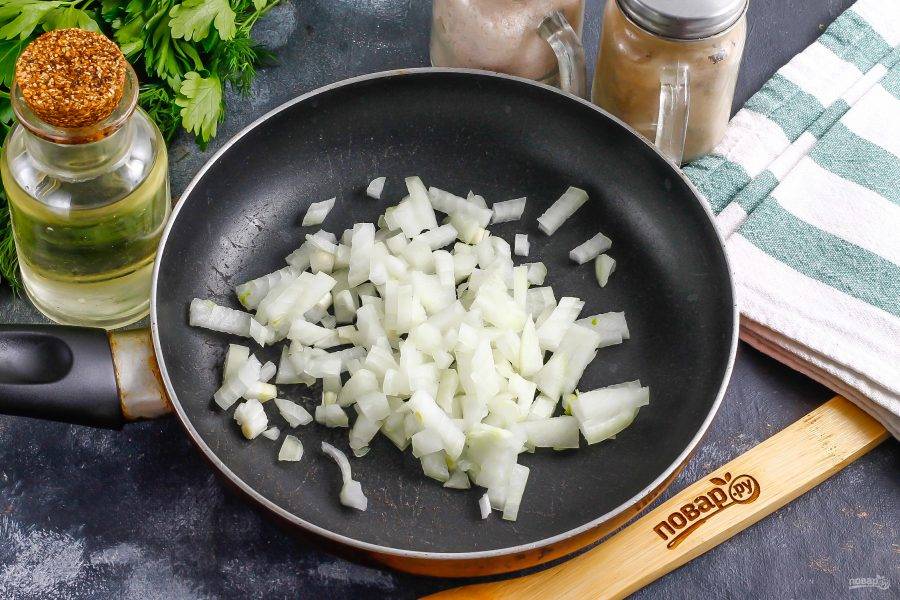 Очистите репчатый лук и нарежьте мелкими кубиками. Отпассеруйте нарезку в растительном масле на сковороде примерно 3-4 минуты до румяности.