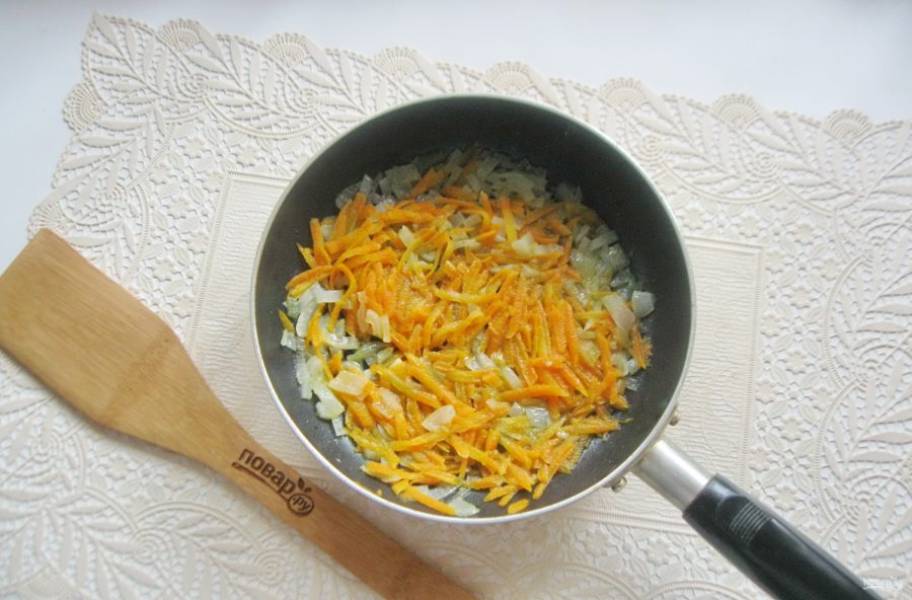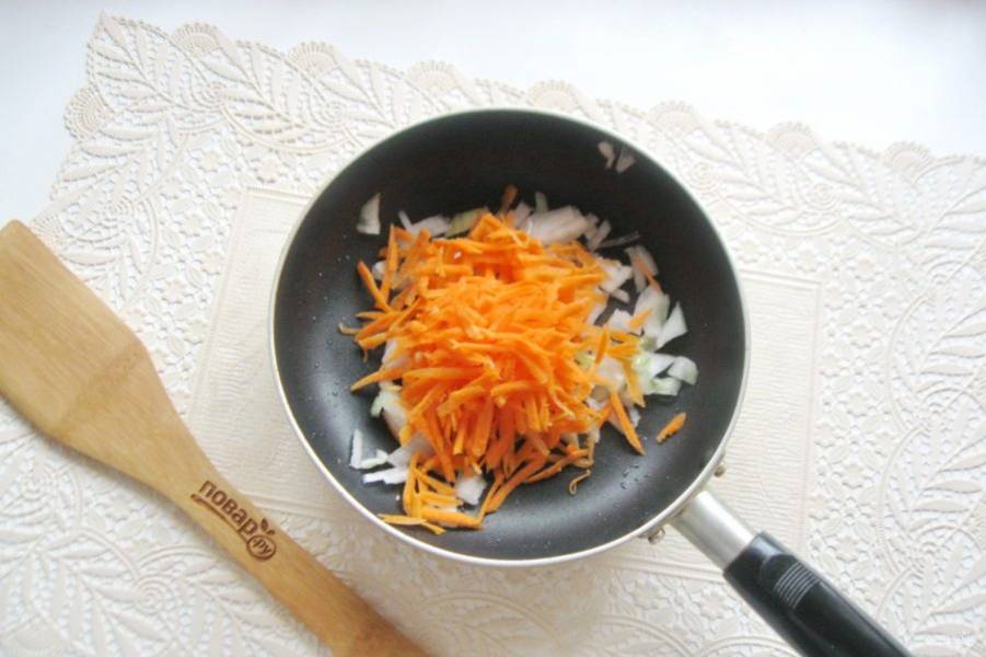Морковь очистите, помойте и натрите на терке. Добавьте в сковороду к луку.