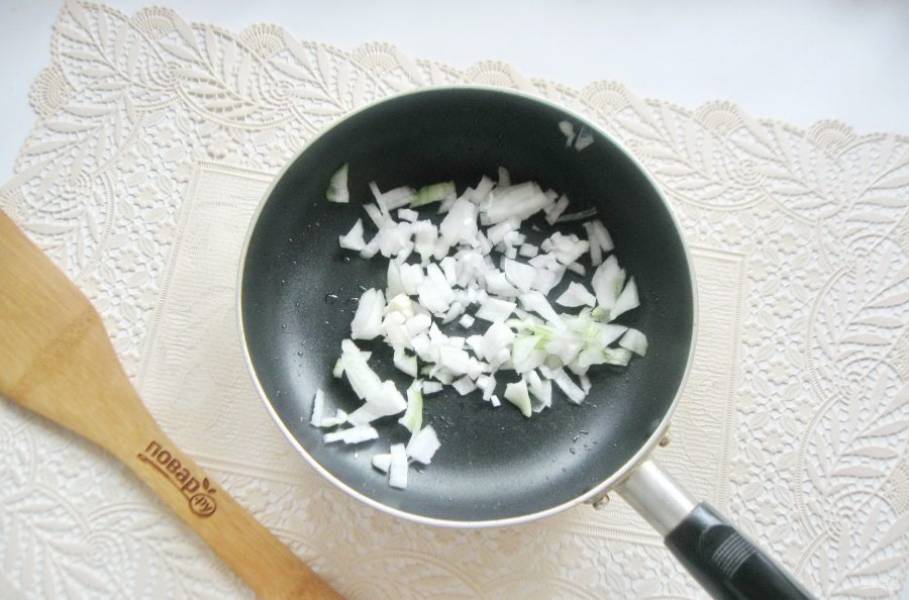 Репчатый лук очистите, помойте и нарежьте произвольно. Выложите в сковороду.