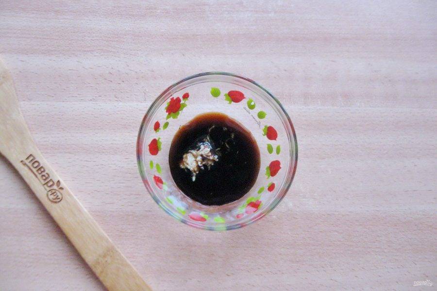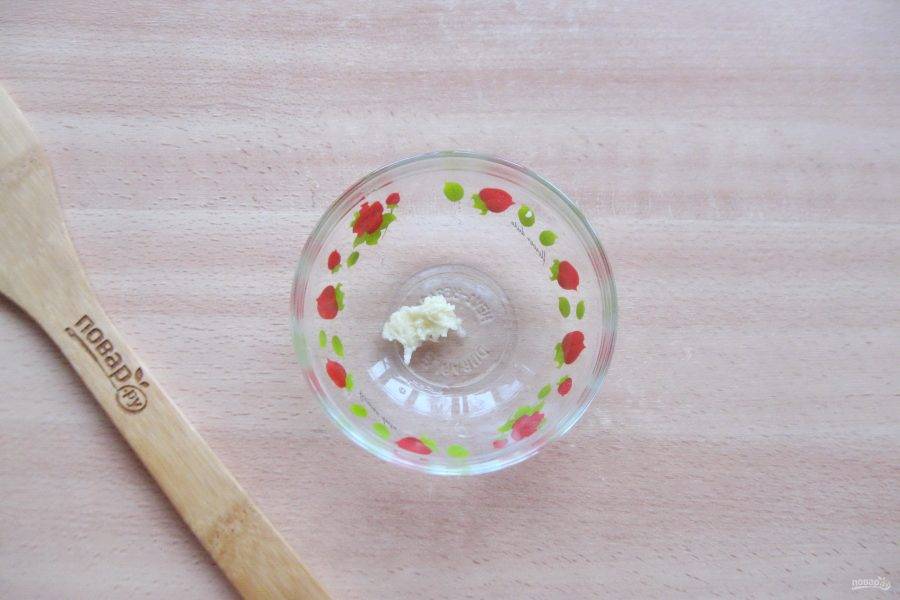 Приготовьте соус. В мисочку выложите измельченный чеснок.