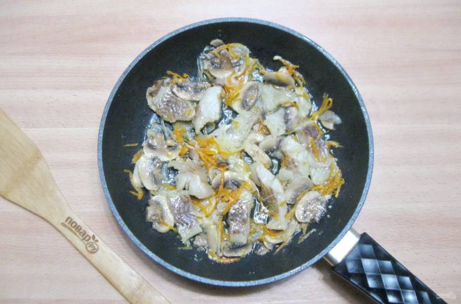 Минтай или филе любой другой рыбы нарежьте и выложите в сковороду с грибами, луком и морковью.