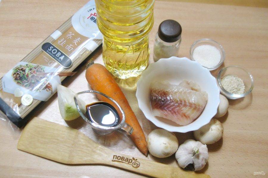 Подготовьте ингредиенты для приготовления гречневой лапши с рыбой.