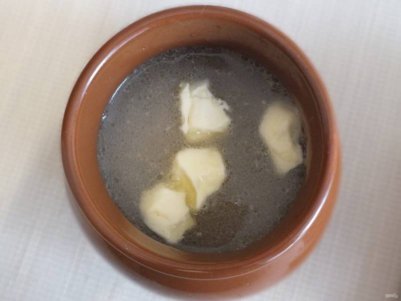 Разогрейте духовку до 180 градусов. Бульон доведите до кипения. В горшочек с крупой положите остатки сливочного масла и залейте (1/2 частью указанного количества) горячим бульоном.