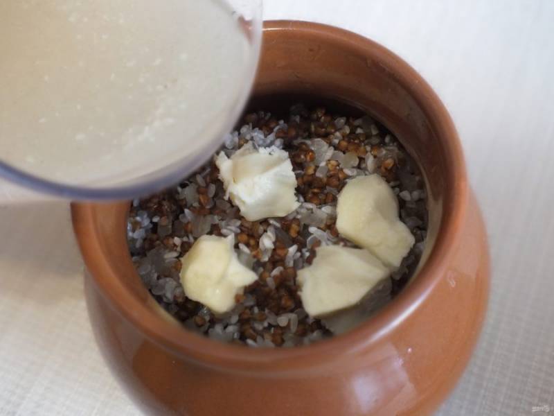 Возьмите керамический горшочек с крышкой. На дно положите половину указанного количества сливочного масла. И переложите крупы с луком.